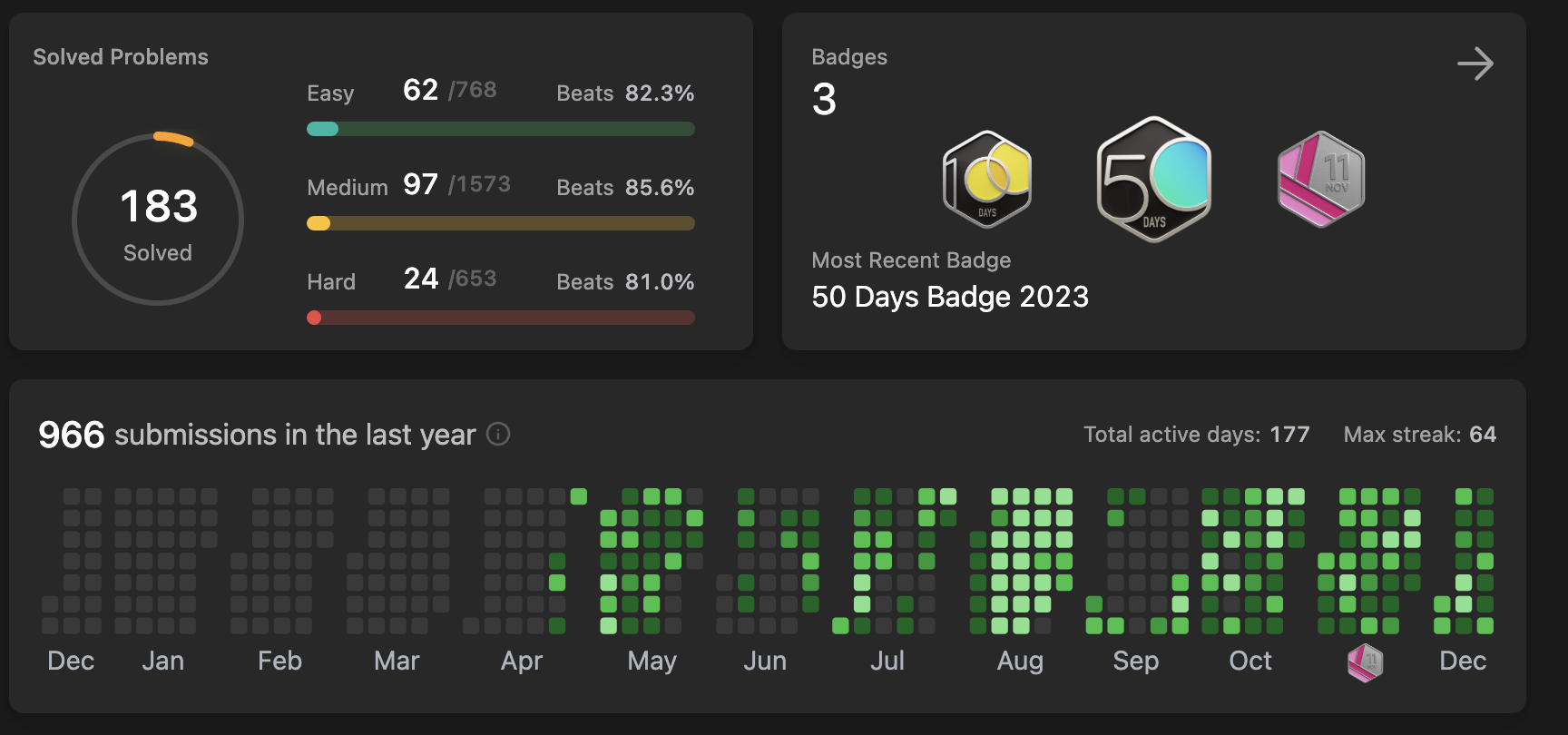 연말에 이런 배지를 받으니 '올 한해 나는 무엇을 했는가'라고 스스로 질문했을 때, 자신있게 '릿코드 문제를 좀 풀었습니다'라고 할 수 있을 것 같습니다.