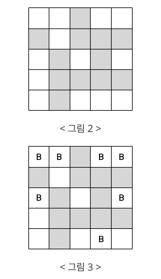 그런데 체스판 위에는 비숍이 놓일 수 없는 곳이 있다. < 그림 2 >에서 체스판에 색칠된 부분은 비숍이 놓일 수 없다고 하자. 이와 같은 체스판에 서로가 서로를 잡을 수 없도록 하면서 비숍을 놓는다면 < 그림 3 >과 같이 최대 7개의 비숍을 놓을 수 있다. 색칠된 부분에는 비숍이 놓일 수 없지만 지나갈 수는 있다.