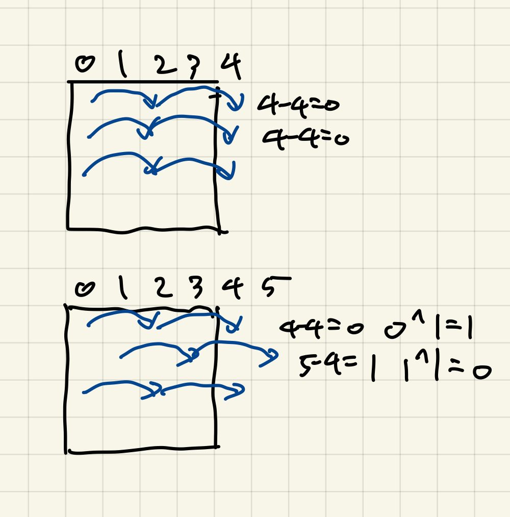 짝수인 경우에는 이렇게만 했다가는 쭉 같은 열로 탐색하게 되는데, 이러면 어긋나게 된다.