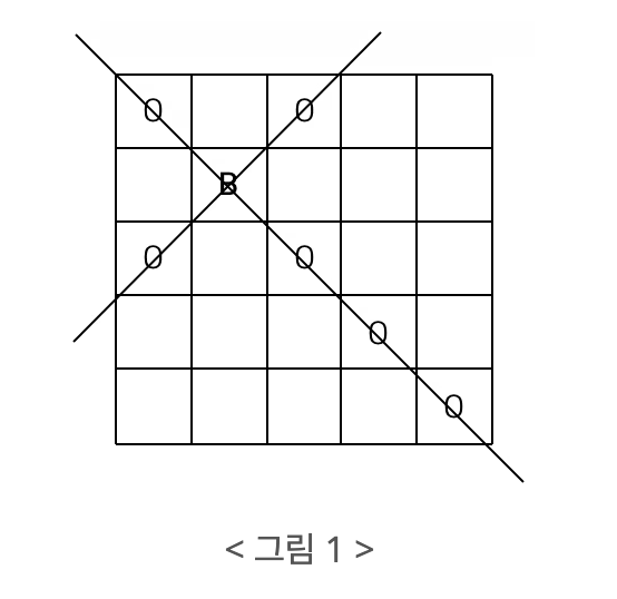 서양 장기인 체스에는 대각선 방향으로 움직일 수 있는 비숍(bishop)이 있다. < 그림 1 >과 같은 정사각형 체스판 위에 B라고 표시된 곳에 비숍이 있을 때 비숍은 대각선 방향으로 움직여 O로 표시된 칸에 있는 다른 말을 잡을 수 있다.