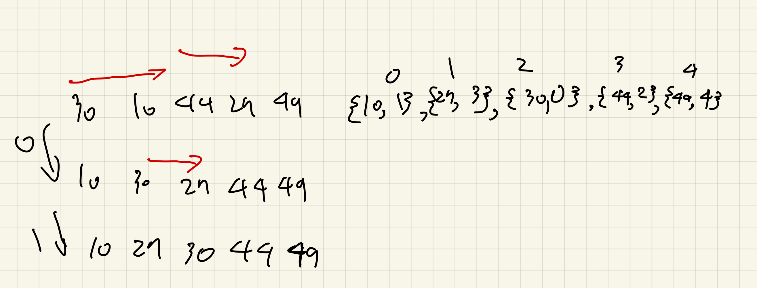 왼쪽 그림부터 보자. 0번째 반복에서 10과 27이 한 번씩 역전당하고, 30과 44는 한 번씩 역전한다.