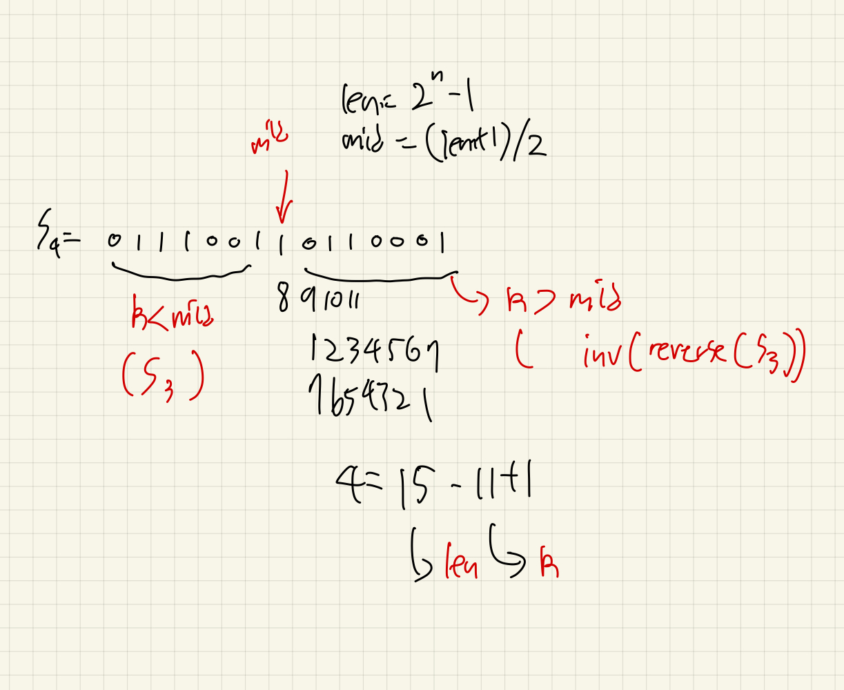 만약 k가 중앙보다 크다면, 문자열 뒤집기와 비트플립을 고려해서, 새로운 인덱스로 호출한다.