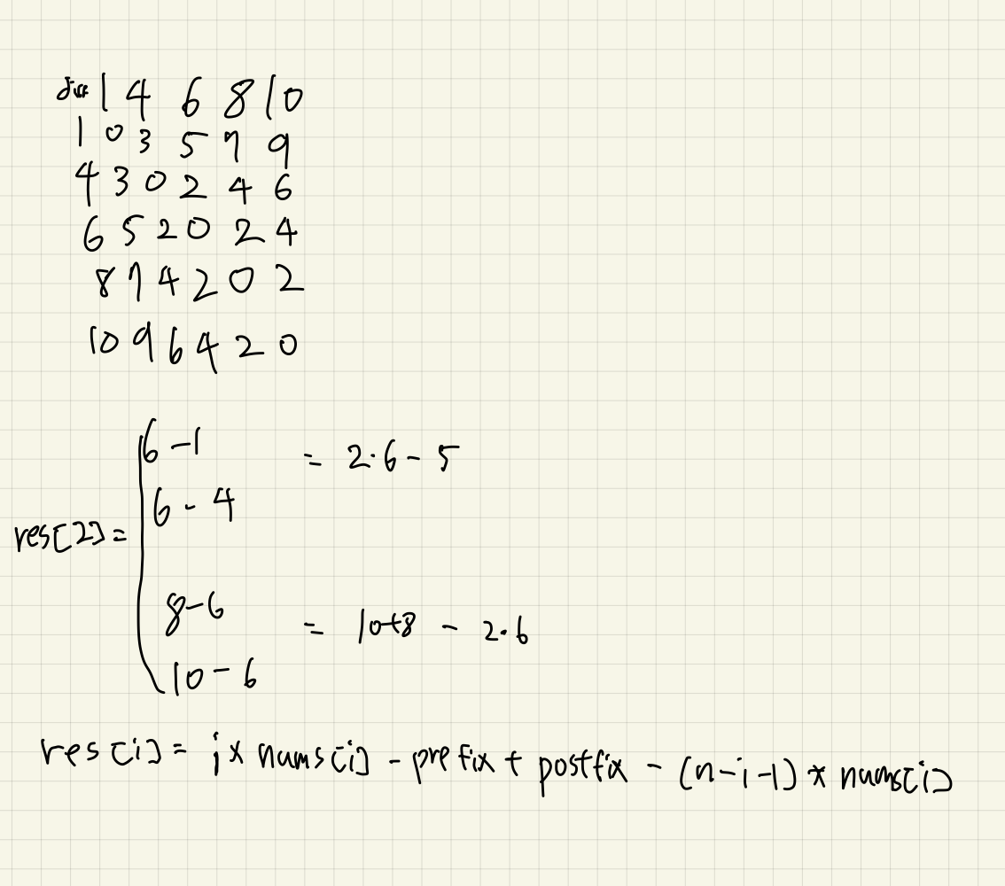 sumOfAbsoluteDiff[i] = (i * nums[i]) - prefix[i] + postfix[i] - (n-i-1) * nums[i];