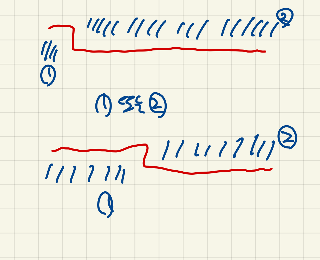빨간색 경로를 첫 번째 로봇이 지난 경로라 하자. 두 번째 로봇은 파란색으로 칠해진 두 가지 영역 중 하나를 먹어야 하고, 그 둘 중 최대가 두 번째 로봇이 얻는 최대 점수이다.