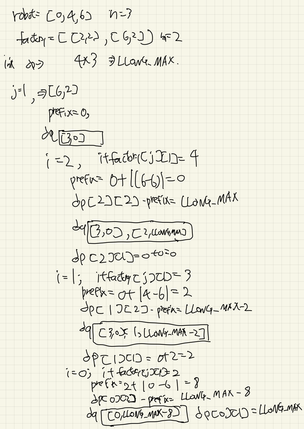 dp[i][j]는, i번부터 로봇을 놔야할 때, j번공장부터 갈 수 있는 최소 로봇들의 이동거리의 합을 말한다.