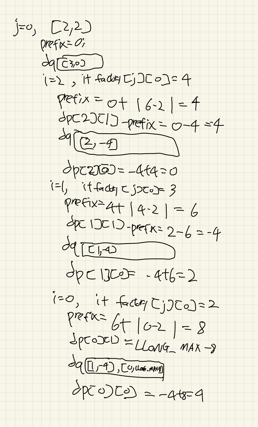 dp[i][j]에는 현재 dq의 맨 앞에 있는 비용 + prefix를 저장한다.