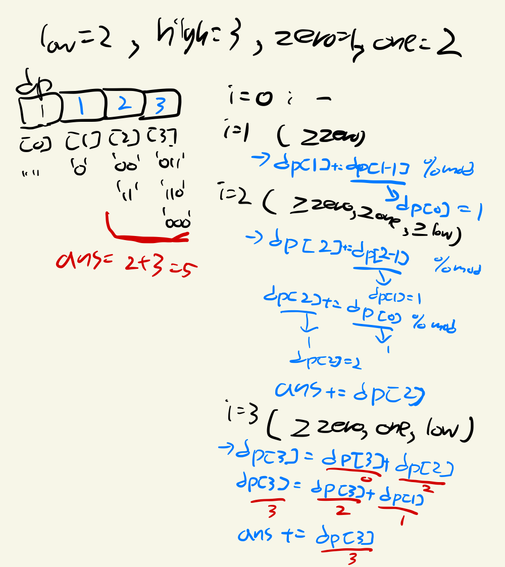 우선, high +1 크기의 dp테이블을 만들어준다. dp[i]는 규칙대로 만들 수 있는 길이가 i인 문자열의 개수이다.