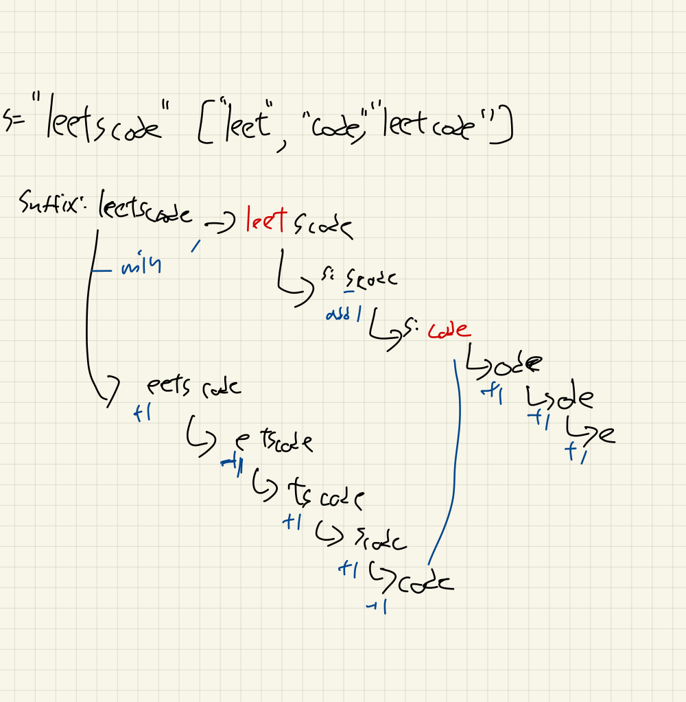 만약 dictionary의 단어 중에서 suffix의 prefix가 될 수 있는 단어가 있다면, dfs를 타고 더 깊이 들어가서 최소값을 갱신한다.