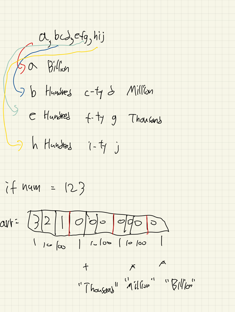 string ans = (nums[9]? numWords[nums[9]] + " Billion ":"") + (n!=""? n + "Million ":"") + (m!=""? m + "Thousand ":"") + convert(0, nums);