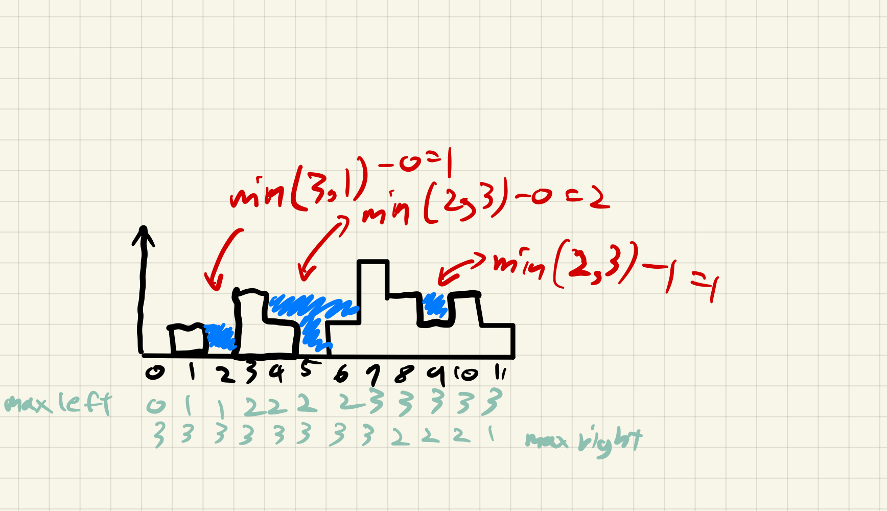 그래서 왼쪽과 오른쪽에서 탐색을 시작하며, 각 쪽에서 최대 높이를 구하고, 만약에 최대 높이가 갱신되지 않는다면 왼쪽과 오른쪽의 최대값중 최소값에서 현재의 높이를 빼면 그 공간의 차는 물의 양이 됩니다.