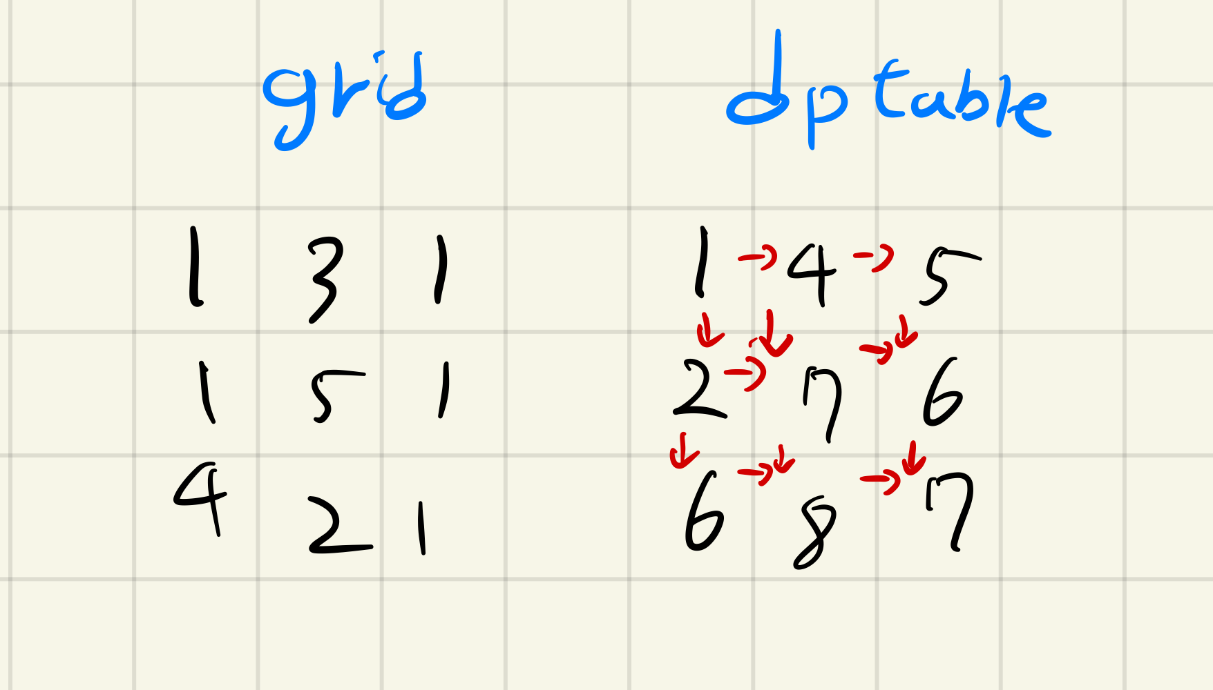 dp[i][j] = min(dp[i-1][j], dp[i][j-1]) + grid[i][j];